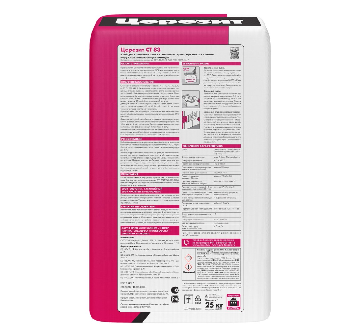 Смесь марки CT 83 – клеевой состав, предназначенный для наружного монтажа пенополистирольных теплоизоляционных панелей. Также применяется при установке плит из минераловаты для устройства противопожарных рассечек. Используется на минеральных основаниях в ходе создания фасадных теплоизоляционных систем Ceresit VWS.