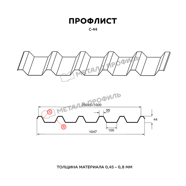 Описание товара: "Профлист МЕТАЛЛ ПРОФИЛЬ С-44х1000-A (ПЭ-01-8004-0,45)"
